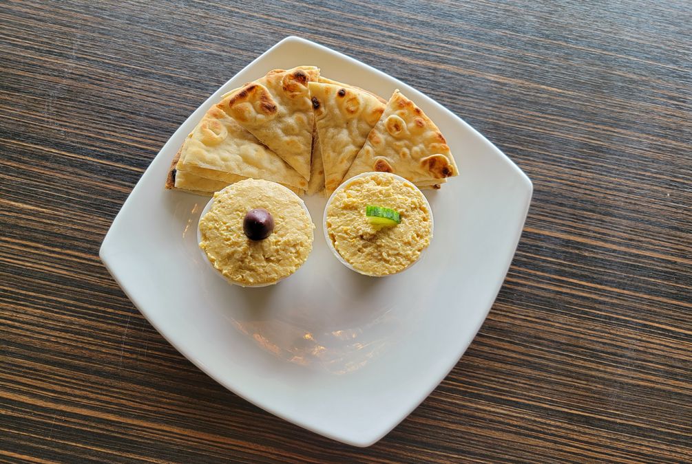 Chickpeas whipped with olive oil and lemon juice, served with hot pita bread.