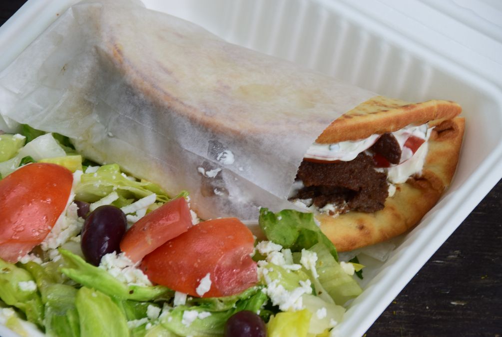 Marinated on a skewer served with your choice of salad, roasted potatoes, rice and tzatziki sauce.